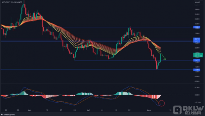 從技術(shù)角度看,WIF 的價(jià)格在日線圖上形成了 V 型復(fù)蘇模式。兩根看漲吞沒蠟燭的出現(xiàn)表明多頭市場正在主導(dǎo)價(jià)格走勢。WIF 的支撐位為1.50美元,8月5日至8月8日,相對強(qiáng)弱指數(shù)(RSI)從27上升至38,顯示出買家的回歸。