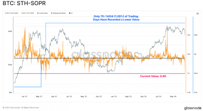 Glassnode指出,當前短期持有者的未實現損失達到了自FTX崩潰以來的最大值,這反映了市場對近期價格波動的高度反應。當前短期持有者中只有7%的Bitcoin處于盈利狀態,這一比例與一年前Bitcoin價格跌破30,000美元時類似。