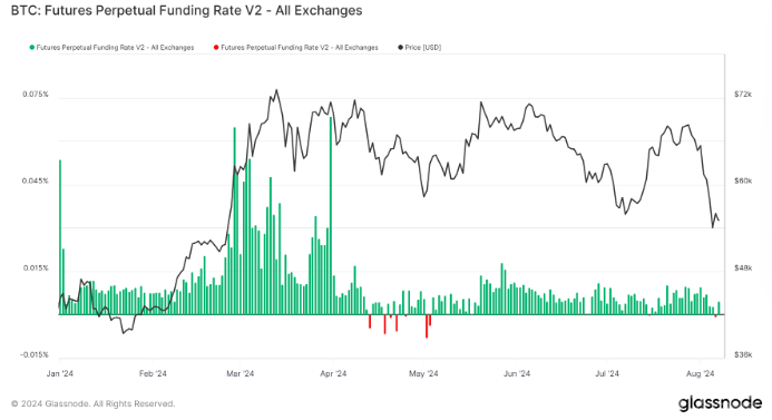 進(jìn)入2024年,市場(chǎng)顯示出相對(duì)穩(wěn)定的資金費(fèi)率環(huán)境。盡管Bitcoin價(jià)格在2024年中期達(dá)到了峰值,但隨后的價(jià)格回調(diào)將其推至55,000美元以下。此期間,資金費(fèi)率穩(wěn)定在接近于零的水平,偶爾跌至負(fù)數(shù)區(qū)域。這表明市場(chǎng)在多空頭寸之間達(dá)到了平衡,投資者的杠桿作用相對(duì)穩(wěn)定,市場(chǎng)情緒趨于平衡。