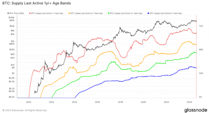 數(shù)據(jù)顯示,自2024年初以來,Bitcoin中未動的供應(yīng)比例逐漸下降。這一變化表明,長期持有者可能開始逐步拋售其持有的Bitcoin,這可能會導(dǎo)致市場出現(xiàn)新的拋售壓力。
