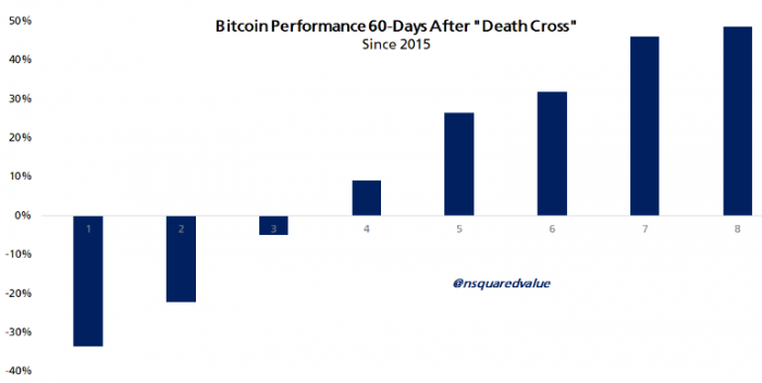另一個Bitcoin分析師Timothy Peterson提出了不同的看法。他認(rèn)為,盡管市場面臨“死亡十字”,但這一現(xiàn)象并不一定意味著長時間的下行。他指出,自2015年以來,Bitcoin曾經(jīng)歷過八次類似的死亡十字,而在這些情況下,通常會在60天內(nèi)出現(xiàn)顯著的價格上漲,漲幅達(dá)62%。