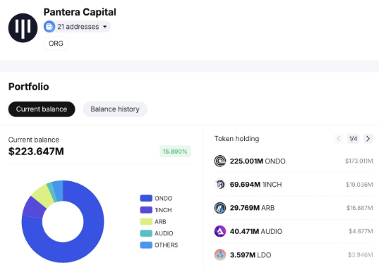 Pantera Capital目前的crypto投資組合顯示出多樣化的資產(chǎn)分布,總金額達(dá)到2.23647億美元。其中,ONDOTokens占總余額的15.89%,約為3551.3萬(wàn)美元,表明公司對(duì)這一資產(chǎn)的依賴,可能是基于其潛在的高回報(bào)。