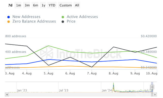 盡管面臨經(jīng)濟(jì)衰退,持有者似乎并未準(zhǔn)備好接受損失。盡管該項(xiàng)目曾因早期空投問(wèn)題而受到爭(zhēng)議,但新地址的數(shù)量在過(guò)去一周內(nèi)增加了30.25%。活躍地址的增長(zhǎng)也顯示出網(wǎng)絡(luò)活動(dòng)正在恢復(fù),對(duì)STRK未來(lái)的發(fā)展形成積極信號(hào)。