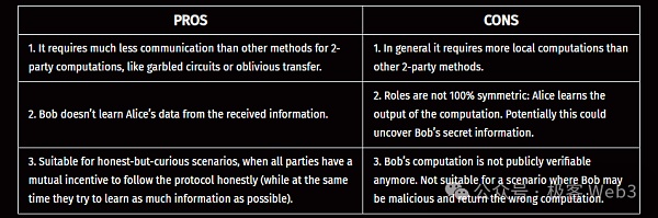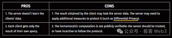 在現實中,FHE外包模式通常被視作TEE等安全執行環境的替代方案,FHE的安全性基于密碼學算法,而不依賴于硬件等實體設備。因此,FHE完全不受被動側信道攻擊或云端服務器被攻擊的影響。想象一下,當某人需要外包出去一些計算任務,但數據非常敏感,他可能不愿意使用搭建在AWS上的虛擬機(VM),因為這類基于云端的服務器背后往往存在更高級的控制人。他也可能對SGX或TEE這類東西猶豫不決,因為運行TEE的主機可以監控該計算任務在執行時產生的功耗或運行時間等,可能通過這些數據來推斷出一些信息。