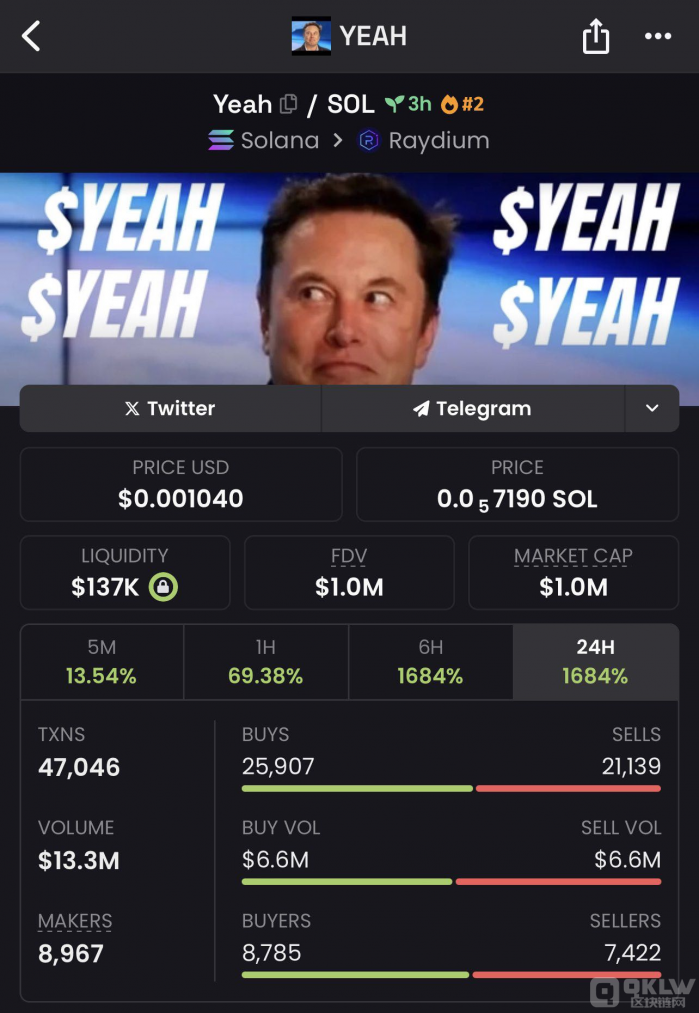 但特朗普和馬斯克作為Meme文化中的流量之王,加密愛好者自然不肯輕易錯失二者聯動時所能產生的熱點。僅僅是因為馬斯克對談期間一句“YEAH”的口頭禪,不明身份的用戶便借題發揮,在Solana鏈上發布了一個同名的資產。