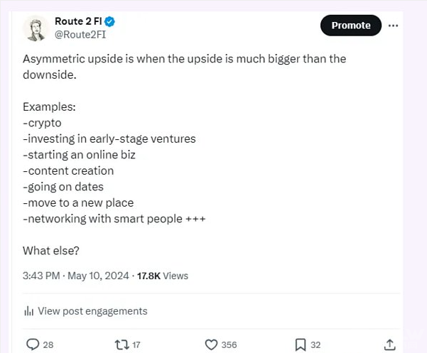 考慮最壞的情況,大多數(shù)冒險(xiǎn)失敗的后果是回到原點(diǎn),但成功的可能性卻能將現(xiàn)有資產(chǎn)增加數(shù)倍。因此,勇于嘗試高風(fēng)險(xiǎn)、高回報(bào)的機(jī)會是值得的。