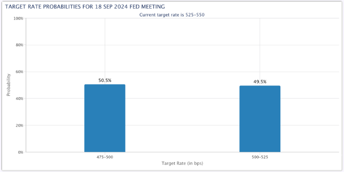 目前,降息50個基點的可能性由昨日的47.5%上升至50.5%,這進一步增強了市場對今日通脹報告的樂觀情緒。