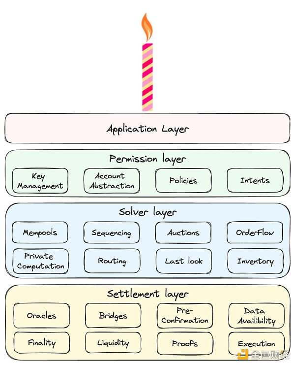 市場上關于鏈抽象的架構分類眾多,比較知名的有FrontierResearch開發(fā)的CAKE框架(ChainAbstractionKeyElements)。這個框架結合了意圖架構,將構成鏈抽象的各種技術和解決方案劃分為權限層、求解層和結算層。也有其他框架在此基礎上做出微調,如Everclear在求解層和結算層之間加入了一層清算功能。