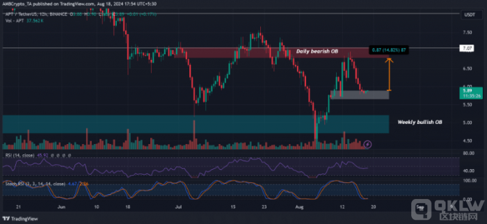 Aptos的這一成就是否會對APT的價格產(chǎn)生積極影響呢?從技術面來看,APT的價格在12小時圖表上已經(jīng)回撤到5.65美元上方的看漲區(qū)塊(OB)和短期支撐位。若市場情緒在新的一周有所改善,APT價格可能會嘗試突破7美元的供應區(qū)域,理論上有可能上漲14%。