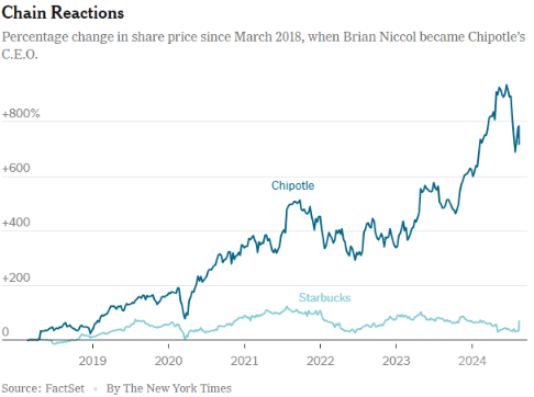 相比之下,星巴克在此期間的股價從60美元上漲至80美元。Niccol的任命消息公布后,星巴克的股價上漲超過20%,而Chipotle的股價則下跌了近12%。