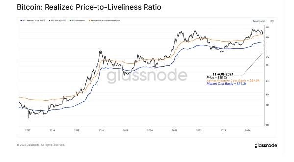 ***橙色線:實現價格與活躍度比率(RealizedPrice-to-LivelinessRatio,RPLR),***橙色線表示的是“實現價格與活躍度比率”,這是一個結合了實現價格和Bitcoin持有行為的指標。它通過比較Bitcoin的“活躍度”(即Bitcoin被持有或花費的時間)來調整實現價格,從而估計Bitcoin的“活躍地址的持幣成本”。