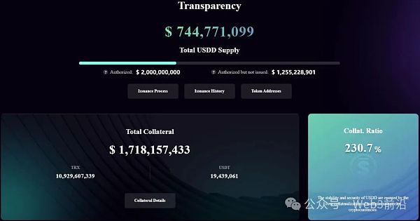 USDD的透明度頁面目前顯示超過7.44億美元的流通量。該穩(wěn)定幣的透明度頁面列出了其儲(chǔ)備中價(jià)值17億美元的TRX和USDT,其抵押率超過230%。