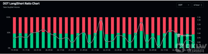 更值得關(guān)注的是,DOT 的多空比率正在下降,表明市場上的空頭頭寸開始增多,這可能會(huì)進(jìn)一步影響價(jià)格穩(wěn)定性。