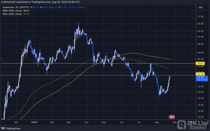 對于AVAX的買家而言,將價格維持在27美元以上至關重要。如果未能穩固在該水平,市場可能會面臨調整,特別是在尚未突破200日移動平均線的情況下。這一指標是確認趨勢向上的重要標志,維持在其上方將表明Avalanche有望進一步上漲。