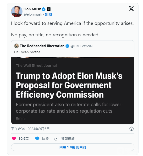 昨日,馬斯克在X平臺轉(zhuǎn)發(fā)了有關川普計劃成立政府效率委員會的新聞,明確表示他愿意接受這一職位。他強調(diào),如果能為美國服務,他不求回報、頭銜或表彰,只是希望為提升政府運作效率貢獻一份力量。