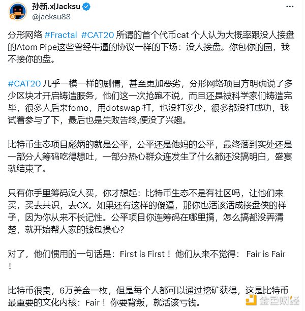另一位KOL@123123crypto則認為,CATProtocol依附于一條Bitcoin的復制粘貼fork鏈FractalBitcoin,但它沒主流共識、沒代表項目,后面大概率也不會太大成就,其地位就相當于Ethreumclassic,未來發展有限。而CAT20依附在這樣一條三無fork鏈,現在市值就1000萬美金了顯然不太合理。