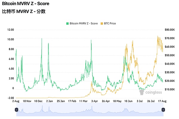 從上圖2010年-2024年數(shù)據(jù)中我們可以看出,相比之前周期,MVRV-Z分?jǐn)?shù)(綠色線)波動(dòng)、峰值和回報(bào)相對(duì)溫和,并不像早期那般幅度大。