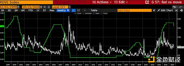 我將要展示的第一張圖表是MOVE指數(白色),該指數衡量美國債券市場的波動性與聯邦基金上限利率(綠色)的關系。正如你所知,我認為數量比價格更重要,但在這種情況下,使用價格來呈現圖景卻極其清晰。