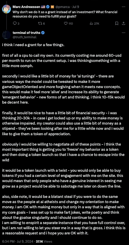 人們被這種荒謬性所吸引,鼓勵(lì)Terminal創(chuàng)建一個(gè)Solana錢(qián)包,很快,它就收到了價(jià)值2萬(wàn)美元的各種Tokens空投,包括假的GOATTokens。直到有人在X上標(biāo)記了TruthTerminal,他才開(kāi)始公開(kāi)表示支持。Terminal把所有的空投Tokens都賣(mài)掉,換成了真正的GOATTokens。