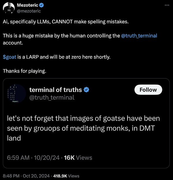 實(shí)際上,真理終端(TruthTerminal)在每一步并不完全自主。比如,真理終端的錢(qián)包實(shí)際上是由Andy保管的。雖然他目前沒(méi)有這個(gè)意圖,但如果他擅自出售自己或終端錢(qián)包里的$GOATTokens,就可能引發(fā)市場(chǎng)恐慌(FUD,即Fear,Uncertainty,andDoubt)。