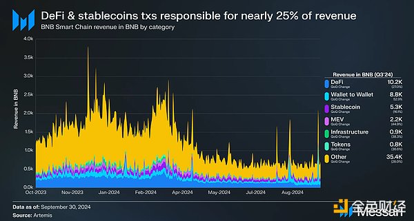 總質押BNB數量連續第三個季度上升,部分原因是質押從BNBBeaconChain過渡到BNBSmartChain。總質押BNB數量環比增長7%,從3040萬增加到3240萬。由于第三季度BNB價格略有下降,質押BNB的總美元價值增幅略小(環比上漲4%,從177億美元增至183億美元)。與其他PoS網絡相比,BNBSmartChain在第三季度末擁有第三高的質押資金美元價值。然而,與排名第二的(Solana)之間的差距為207億美元。MEV