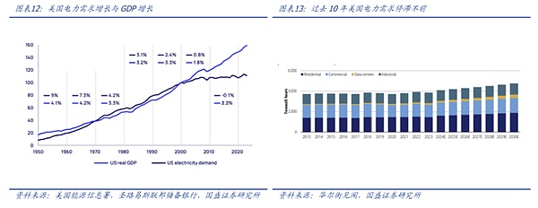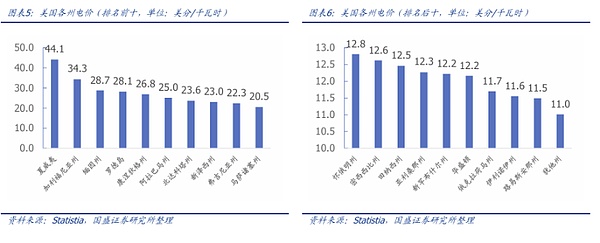 電價:美國是全球電價最低的國家之一,且個別州因為能源優勢有更低的電價水平。美國電力消費結構主要劃分為4個領域:居民、商業、工業和運輸。2024年9月居民用戶電價為0.17美元/千瓦時(約折1.24元/千瓦時,匯率截至12月13日),商業用戶電價為0.135美元/千瓦時(約折0.98元/千瓦時);工業用電價為0.09美元/千瓦時,運輸用電價為0.13美元/千瓦時,2023年批發電價為0.036美元/千瓦時。而一些州因為其能源優勢電價水平較低,截至2024年4月,德克薩斯州(天然氣和可再生能源豐富)的電價約為0.147美元/千瓦時、路易斯安那州(能源資源豐富)約為0.115美元/千萬時、田納西州(水電資源豐富)約為0.125美元/千瓦時。一些較為耗電的大型基建比如數據中心等,往往在低電價省份建設,上述州府也成為當今算力產業集中地。