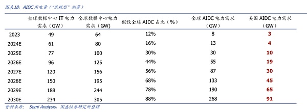 研究公司SemiAnalysis利用了5000多個數據中心的分析和建設預測,并將這些數據與全球數據以及衛星圖像分析相結合,預計未來幾年數據中心電力容量增長將加速至25%的復合年增長率,同時AIDC占比將進一步提升,數據中心方面,根據預測數據,全球數據中心關鍵IT電力需求將從23年的49GW激增到26年的96GW,我們假設27-30年繼續保持數據中心25%的復合增速(參考2023到2026年增速,為25%),那么到29、30年全球數據中心關鍵IT電力需求分別增長至188、234GW;參考SemiAnalysis數據,結合AI算力蓬勃發展、下游應用陸續爆發大背景,我們認為未來AI在數據中心中占比有望持續加速提升,因此我們假設23-30年全球AIDC占比分別達到12%/16%/30%/44%/56%/68%/78%/88%,從而計算出29、30年全球的AIDCIT設備電力需求分別為65GW、91GW。