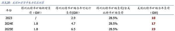 在我們2024年8月6日發布的報告《AI東風已至,Bitcoin礦場開啟第二增長曲線》中,對Bitcoin礦場用電量進行過假設和預測,在該報告中,據我們預測2024/2025/2026/2027/2028年得州Bitcoin礦場負荷分別為4.7/6.5/8.3/10.1/11.9GW(假設得州Bitcoin礦場年新增負荷為1.8GW),關于得州Bitcoin礦場負荷在美國的份額,我們假設保持28.5%不變,因此據我們預測美國Bitcoin礦場年負荷分別為17/23/29/36/42GW。