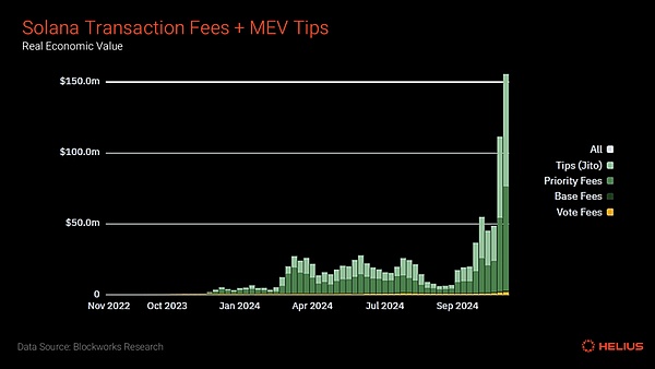 MEV獎勵在質押獎勵的組成中扮演著越來越重要的角色。鏈上交易量的上升和隨之而來的套利機會推動了這一增長。最近,JitoMEV小費約占總獎勵的20-30%,大幅提升了質押者的收益。與發行獎勵類似,驗證者對MEV小費收取從0%到100%的傭金。Jito還對所有與MEV相關的收入收取5%的傭金。