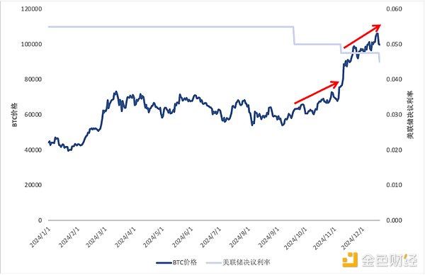 縱觀2024整年的幣價變化,今年年初牛市行情消退后幣價走勢處于震蕩狀態,自9月宣布降息后,相較于3月至9月幣價走勢,幣價開始呈現震蕩上升趨勢。11月第二次宣布降息后,排除特朗普獲選消息對市場帶來的短期飆升外,市場在11月及12月內的上漲幅度相較于9月至11月再次上升。今年的前兩次降息對長期幣價均有明顯的提振效果,雖然12月的降息發布的同時帶來了少許回調,但就2024年幣價與利率的相關性來看,未來數月內幣價不會跌破現有水平,更有可能隨著利率的降低以及明年特朗普上任后落地的Crypto利好政策繼續升高。