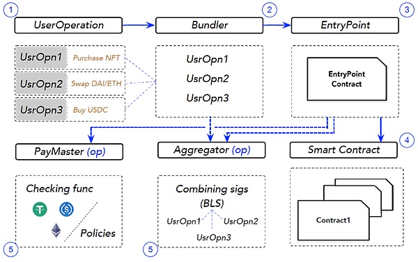 ERC-4337是一個(gè)賬戶抽象提案,它在不改變Ethereum核心協(xié)議的情況下工作。相反,ERC-4337創(chuàng)建了一個(gè)額外的基礎(chǔ)設(shè)施層,圍繞替代內(nèi)存池進(jìn)行中心化。該層允許智能合約驗(yàn)證、執(zhí)行和與UserOperations交互。這些特殊的類似交易的對(duì)象使智能合約能夠成為主要賬戶。同時(shí),Bundlers處理它們的收集、聚合和提交到Blockchain。