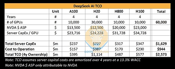 Semianalysis(一家專注半導體和人工智能的獨立研究與分析公司)也給出了DeepSeek的AITCO(人工智能領域中的總成本)分析,這張表總結了DeepSeekAI在使用四種不同型號GPU(A100、H20、H800和H100)時的總成本情況,包括買設備、建服務器和運營的費用。按照四年周期來算,這60,000塊GPU的總花費是25.73億美元,其中主要是買服務器的費用(16.29億美元)和運營的費用(9.44億美元)。