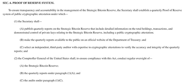 美國總審計長應確保本法的遵守,并對相關事宜進行定期監督??倢徲嬮L的職責包括監督財政部長和獨立審計師的工作,確保他們遵循既定的法律和程序。此外,總審計長還將負責評估和報告戰略Bitcoin儲備管理的整體效率和效果,為政策制定者和公眾提供重要的參考信息。
