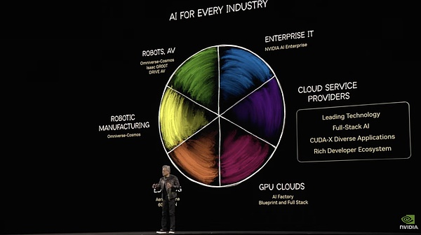 這里面,每個環節,每個產品都對應著一個潛在的千億級市場。早年孤注一擲的好運賭王黃仁勛,靠著GPU壟斷得來的錢,開始做一場更大的賭局。