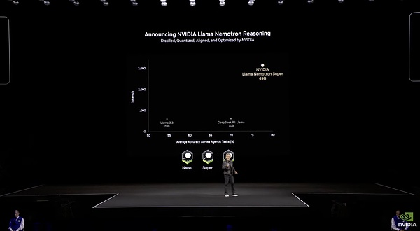 英偉達在這次GTC上用一款新模型LlamaNemotron,主打高效、準確。它是由Llama系列模型衍生而來。經過英偉達特別微調,相較于Llama本體,這款模型經過算法修剪優化,更加輕量級,僅有48B。它還具有了類似o1的推理能力。與Claude3.7和Grok3一樣,LlamaNemotron模型內置了推理能力開關,用戶可選擇是否開啟。這個系列分為三檔:入門級的Nano、中端的Super和旗艦Ultra,每一款都針對不同規模的企業需求。