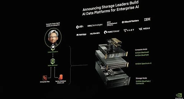 在此之上,英偉達還推出了AI數據平臺,把AI推理模型接到企業數據的系統上,形成一個針對企業數據的DeepReasearch。使得存儲技術的重大演進,使得存儲系統不再僅是數據的倉庫,而是擁有主動推理和分析能力的智能平臺。