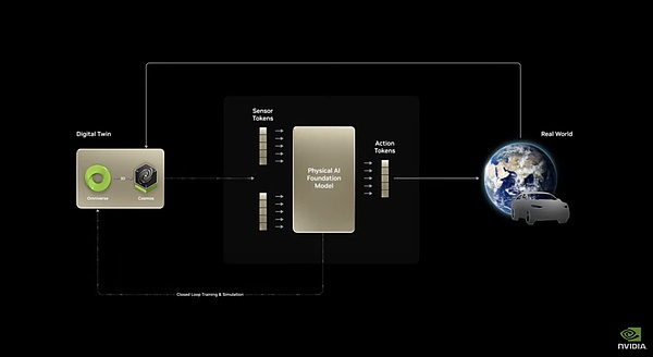 有了這三部分能力逐步疊加,Cosmos就可以做到從現實圖像token+文字命令提示token輸入到機器動作token輸出的完整行為鏈路。