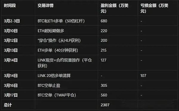 極致杠桿:3月10日,兩次超短線ETH多單均以100%勝率斬獲220萬(wàn)美元;3月12日,存入522萬(wàn)USDC,以50倍杠桿建立14萬(wàn)枚ETH多單(價(jià)值2.7億美元),占平臺(tái)ETH總倉(cāng)位的24.65%。