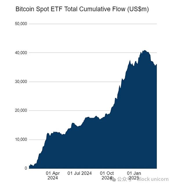 截至2025年初,幾乎所有ETF流動性都流向了Bitcoin,總額達400億美元,如圖表所示。難怪Ethereum多年來對Bitcoin一直在下跌。大多數(shù)山寨幣也是如此。