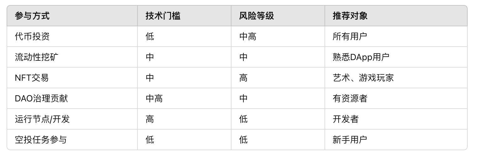 在這樣的架構下,用戶不僅是使用者,更是建設者與權益分享者,因此Web3為參與者提供了多種收益途徑。
