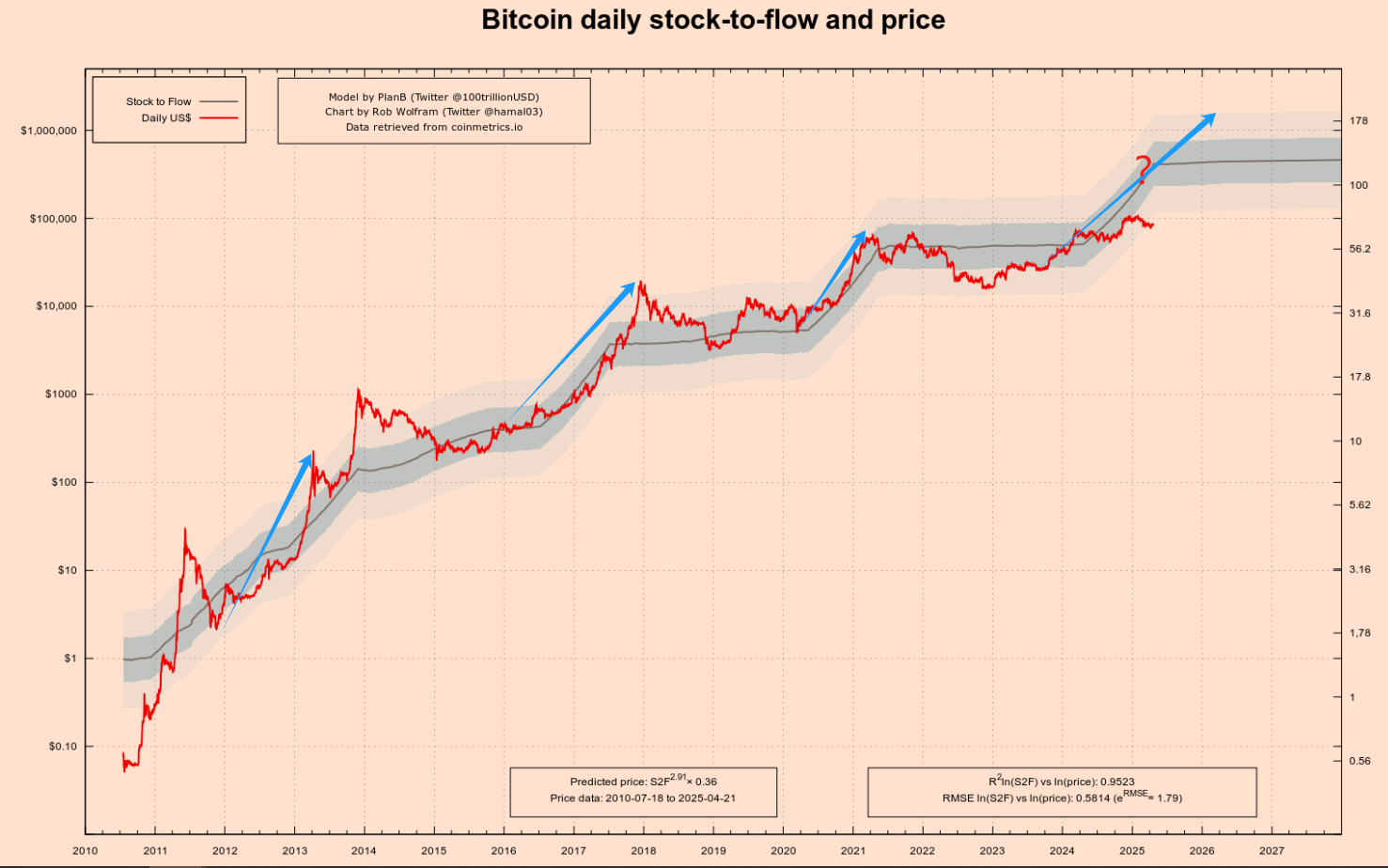 在幣圈最流行的一張圖之一,叫做BitcoinS2F模型擬合圖,如下圖所示。它不僅以視覺上的簡潔直觀著稱,更因為背后的邏輯一度成為“Bitcoin長期價格上漲”的最有力證明之一。