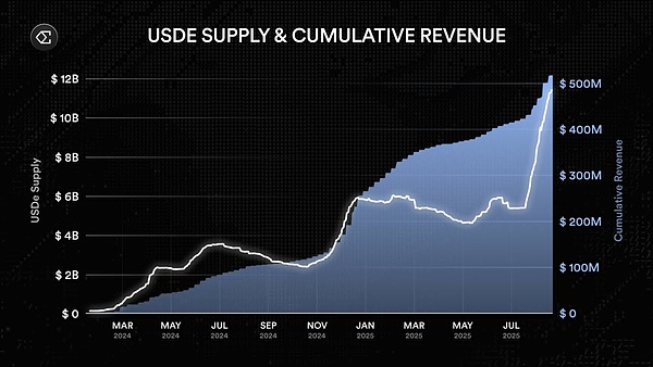 短期(戰(zhàn)術(shù)層面):USDe已經(jīng)成長為DeFi最大的收益型資金蓄水池。其 125億美元的流通規(guī)模和在Aave上47億美元的風(fēng)險(xiǎn)敞口,使其在DeFi借貸市場中具備了“一級(jí)抵押資產(chǎn)”的地位。與此同時(shí),USDe的 9–11%年化收益已被市場視為類“無風(fēng)險(xiǎn)利率”,成為流動(dòng)性聚合的核心錨點(diǎn)。這一階段的邏輯在于:規(guī)模與收益的持續(xù)強(qiáng)化,讓USDe成為全生態(tài)的資金樞紐,為協(xié)議現(xiàn)金流提供了穩(wěn)定積累。