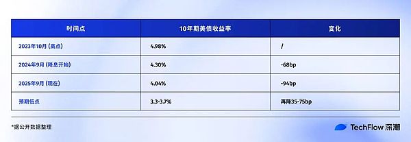 換算成價格,如果10年期美債收益率再降50個基點(diǎn)到3.5%左右,持有10年期國債的投資者還能獲得約5%的資本利得。對債券投資者來說不錯,但對習(xí)慣了動輒翻倍的加密玩家,可能會覺得收益較低。