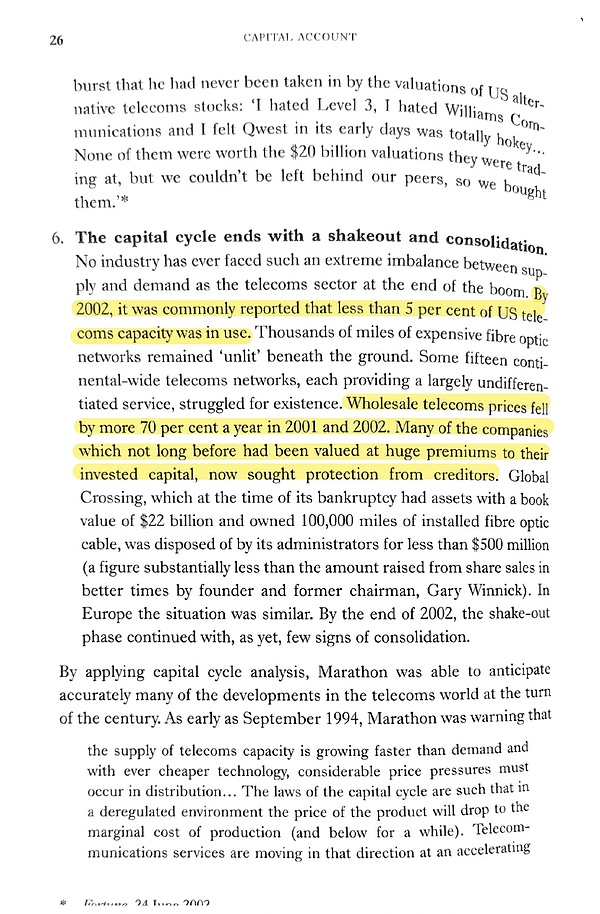 此處引用了書中關(guān)于電信行業(yè)供應(yīng)過剩、價(jià)格暴跌的內(nèi)容,提到直到2002年,光纖利用率不足5%
