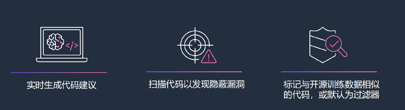 CodeWhisperer是一款可以通過使用引擎蓋下的FM根據開發人員的自然語言評論和IDE中的先前代碼實時生成代碼建議的AI編碼伴侶,可以顯著提高開發人員的效率。該工具目前提供十余種開發語言,如Python、Java、JavaScript、TypeScript、C#、Go、Kotlin、Rust、PHP和SQL等,并且可以通過在VS Code、IntelliJ IDEA、Amazon Cloud9等集成開發環境中的Amazon Toolkit插件進行訪問。此外,CodeWhisperer利用亞馬遜云科技在安全方面的積累來掃描各種安全問題,能夠自動掃描代碼中的安全漏洞并幫助用戶修復,從而增強代碼的安全性。