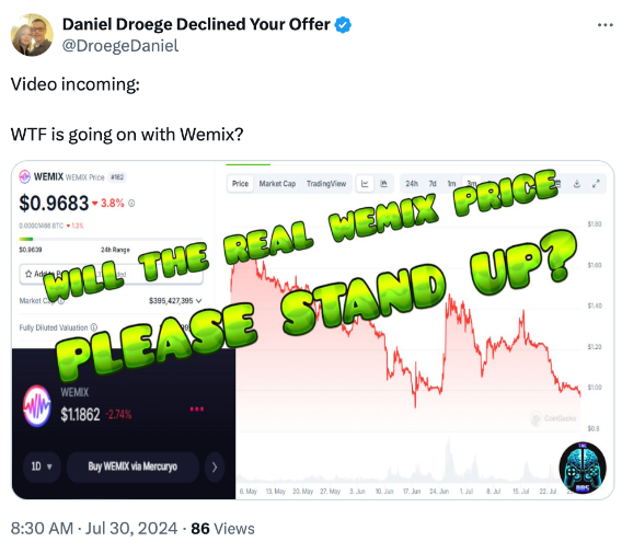 在宣布暫停借貸服務的前一天,Wemade 前首席執行官 Jang Hyun-kook 出售公司股票的消息傳出,導致 WEMIX 價格跌至年度低點0.94美元。這一消息震動了市場,進一步加劇了投資者的不安情緒。