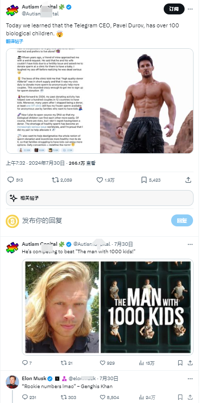 埃隆·馬斯克也是生孩子的狂熱愛(ài)好者,他發(fā)推文回應(yīng)了杜羅夫的爆料:“新手?jǐn)?shù)據(jù)”,他提到了成吉思汗,他與近 500 名妻子育有 100 多個(gè)孩子。馬斯克本人是12 個(gè)已知孩子的父親,不過(guò)不是通過(guò)精子捐贈(zèng)。