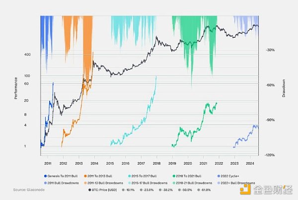 BTC牛市周期走勢通常以指數(shù)級上漲和大幅下跌為特征。本輪周期與以往不同,跌幅較小:8次5%-20%的跌幅,2次20%-30%的跌幅,沒有一次跌幅超過30%。