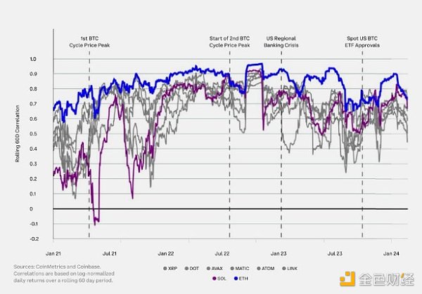 加密資產(chǎn)相關(guān)性在第二季度下降:ETH的相關(guān)性為0.7,一些山寨幣甚至低于0.5。這種相關(guān)性的脫鉤標(biāo)志著市場對Tokens基本面有了更深入的理解。隨著監(jiān)管的明確性和機(jī)構(gòu)的采用,預(yù)計(jì)相關(guān)性會進(jìn)一步下降。
