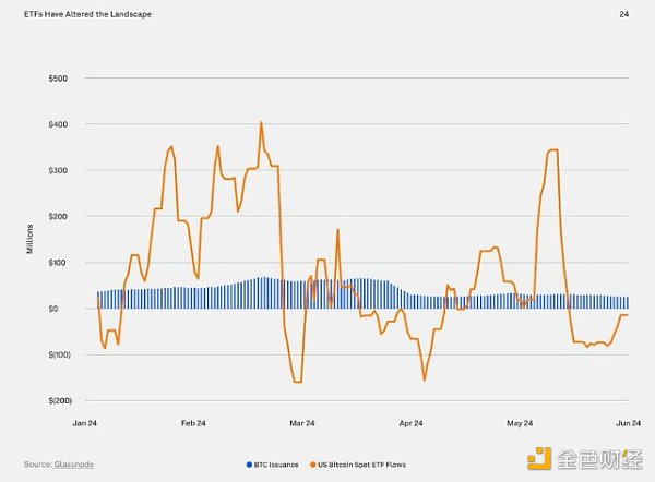 現(xiàn)貨ETF推動了對BTC的大量新需求,而新的BTC供應(yīng)仍然局限于礦工獎(jiǎng)勵(lì)。自現(xiàn)貨ETF開始交易以來,ETF的需求大大超過了BTC的發(fā)行量。